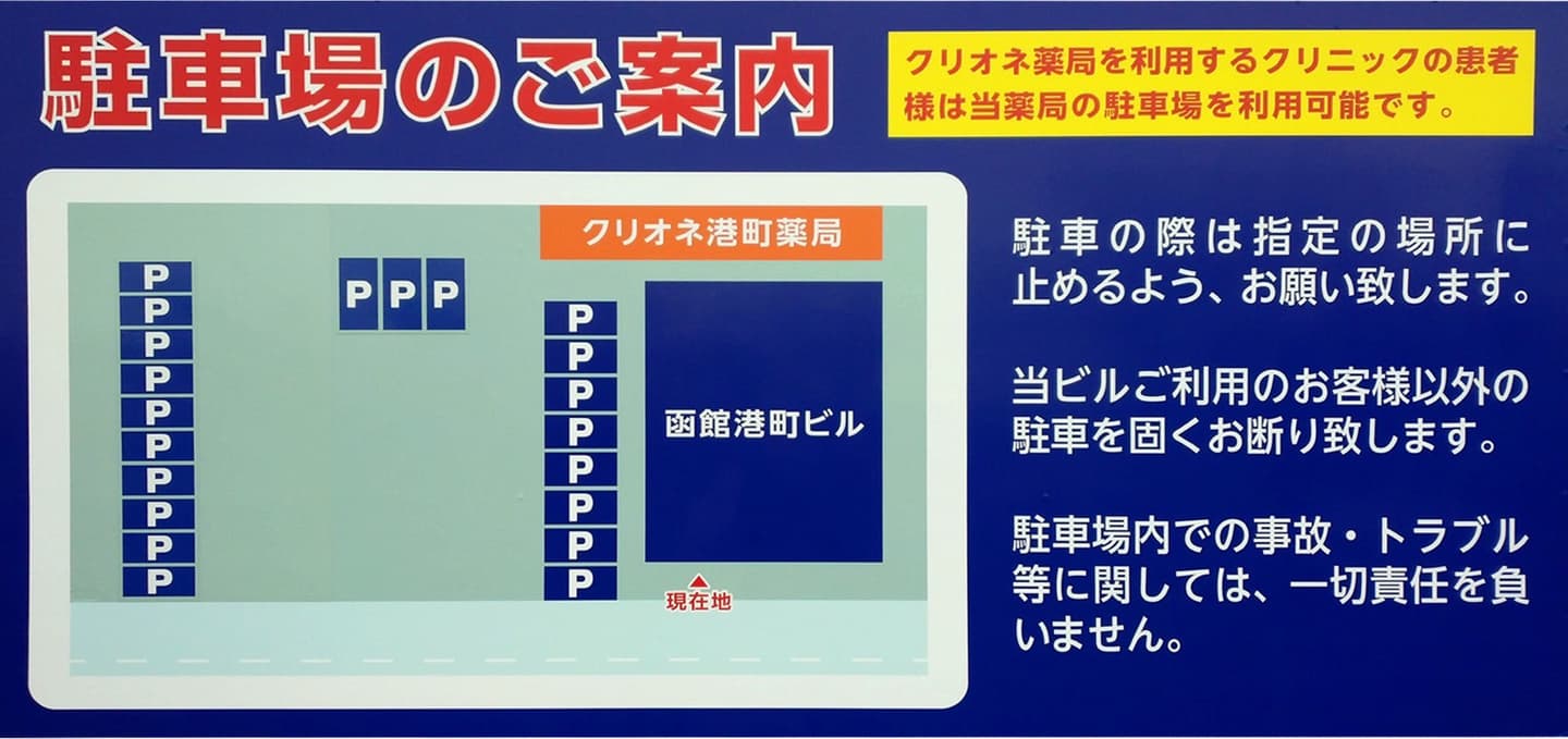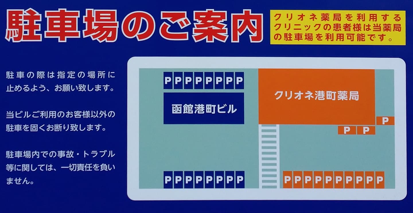 函館港町ビル前と裏に駐車場が計28台分ございますのでお車の際はどうぞお使いください。